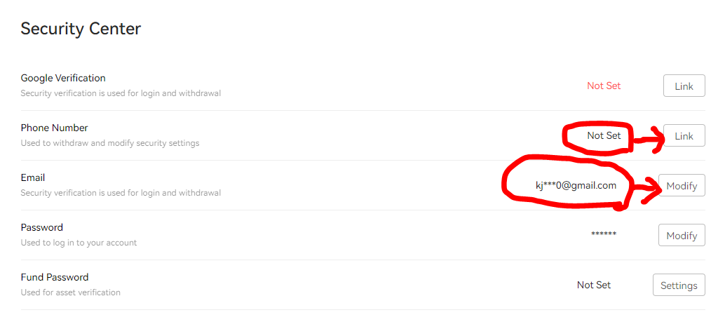이렇게 나옵니다. 밑에 동그라미 친 2개가 Verification = KYC , Security Center = 이메일 및 핸드폰번호 인증 입니다.