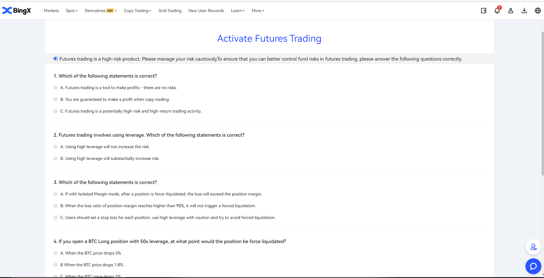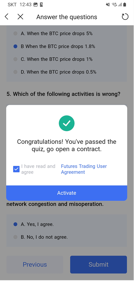 그 밑에 activate Futures Trading 라고 초록색으로 떠져 있는 창은, 선물거래를 하기전에 알아야할 주의사항인데 이걸 퀴즈로 풀어야합니다.