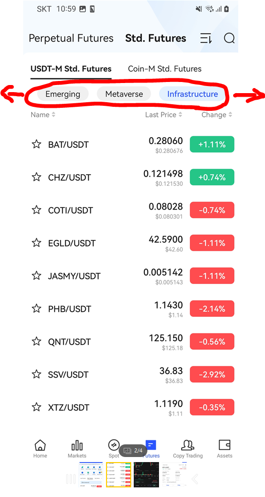 세번째에 Derivatives(파생상품) 에 마우스 커서를 가져다 대면 퍼페츄얼(Perpetual Futures), 스탠다드(Standard Futures)를 누를수 있습니다.