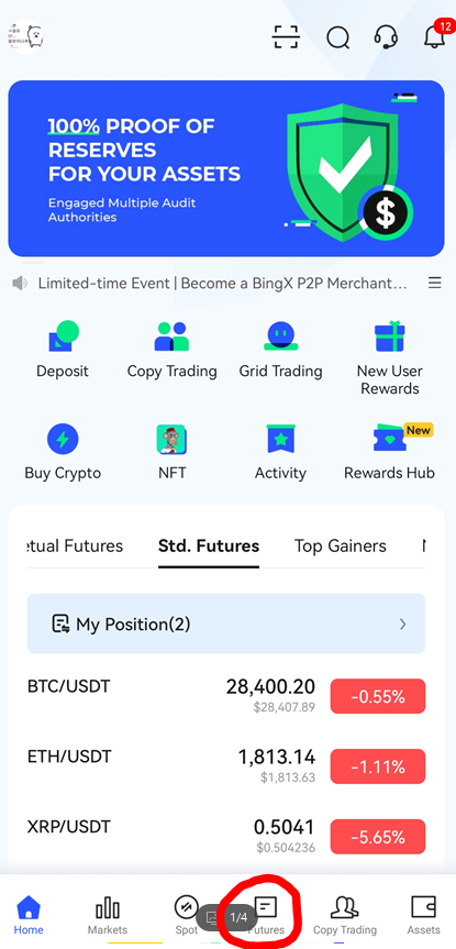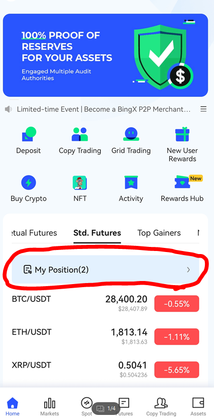 만약 빙엑스 어플로 매매를 하는데 어플을 껐다 켰더니 잡은 포지션이 어디에 나와있는지 안보여요 한다면,