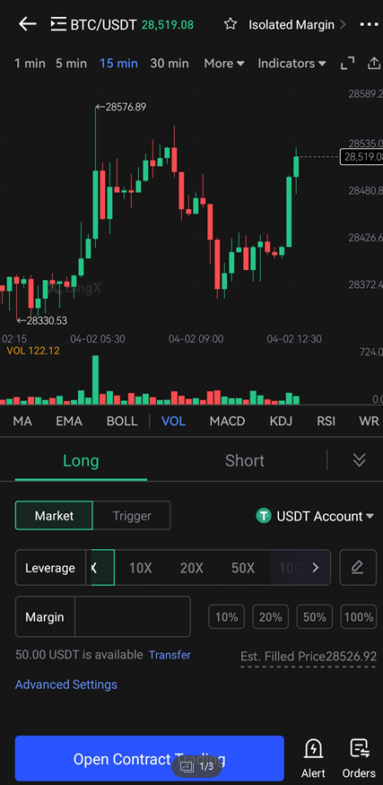 처음 누르면 이렇게 나올텐데 맨 밑에 파란색으로 Open Contract Trading 를 누르면 위에 PC버전과 똑같이 마진거래에 대해 주의사항을 퀴즈로 풀라고 나옵니다.
