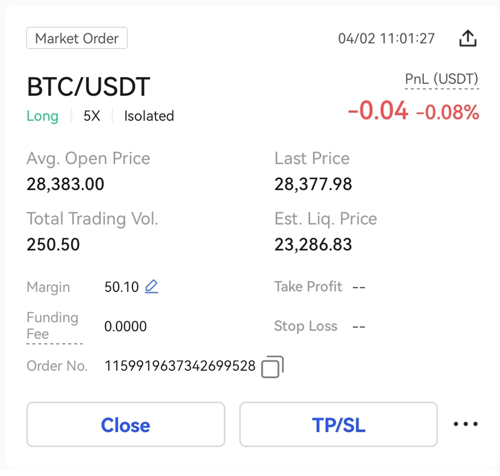 4. If you open a BTC Long position with 50x leverage, at what point would the position be force liquidated?